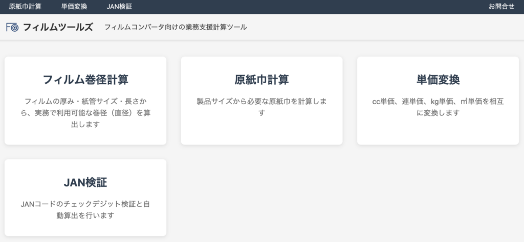 AIで業務ツールを作ると、どんな仕上がりになるか見てみたい方は filmtools.jp をご覧ください。フィルムパッケージ向けの計算ツールをAIを活用して量産しました。
